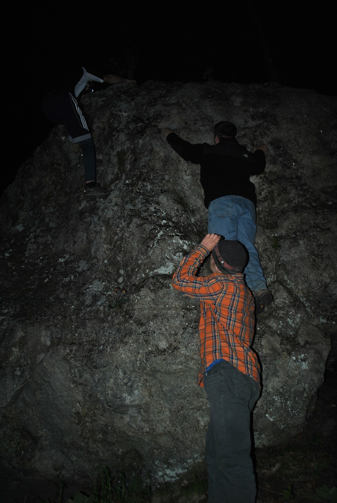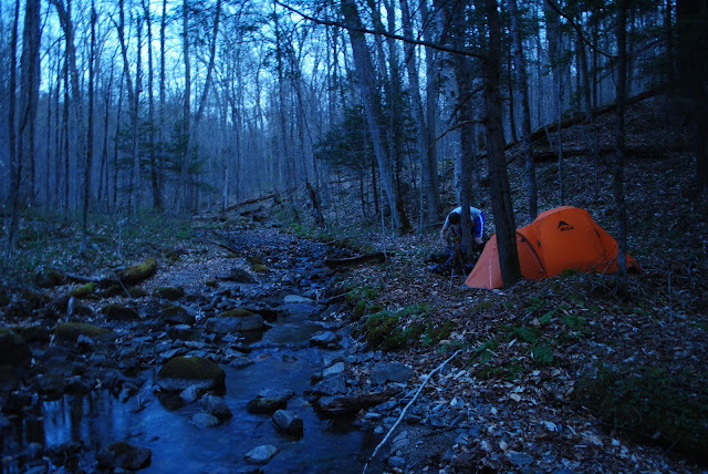 Rain was in the forecast from 2am Saturday morning until the end of Sunday, so it didn't seem like ideal weather for an overnight climbing trip starting Friday night. Cam and I decided to give it a go anyways, planning to aid climb if the weather was too bad. Armed with all of our normal gear, a 60m static rope, 2 jumars, and a tent, we left Troy at 4:20pm and drove toward exit 25 on 87N. We decided to drive past where we had to park and look for a general store to get some extra food to eat before we headed out to find a tent site. This was a good move, we got a box of couscous and other snacks, including a bag of Doritos that we left in car for the ride back. There are no trails or designated camping areas around the cliffs, so we had to navigate through the forest to end up at our final destination for the night.