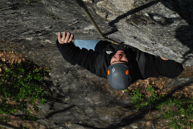 Back on solid ground, we packed up our bags and hiked to the Sunset Arete Area, further left along the cliff. The route that we first went to was Sunset Arete (5.7 PG 150'). The second pitch was supposed to be dirty, so not really worth the climb. Instead, we only did the first pitch (70'). I decided to give it a try on lead, but backed down part way up the arete when it appeared that there was no protection for a while, and I didn't really feel like hitting the deck if I fell. Cam ended up finding some interesting nut placements and built an anchor off of a tree. We lowered on the other side of the arete to end the day with some carefree top roping. The first route that Cam TR'd was Son of Cirrhosis (5.8+ G 60'). To the right of this route was a nice looking face with tiny positive edges and some smooth bulges that we messed around on for a little while.